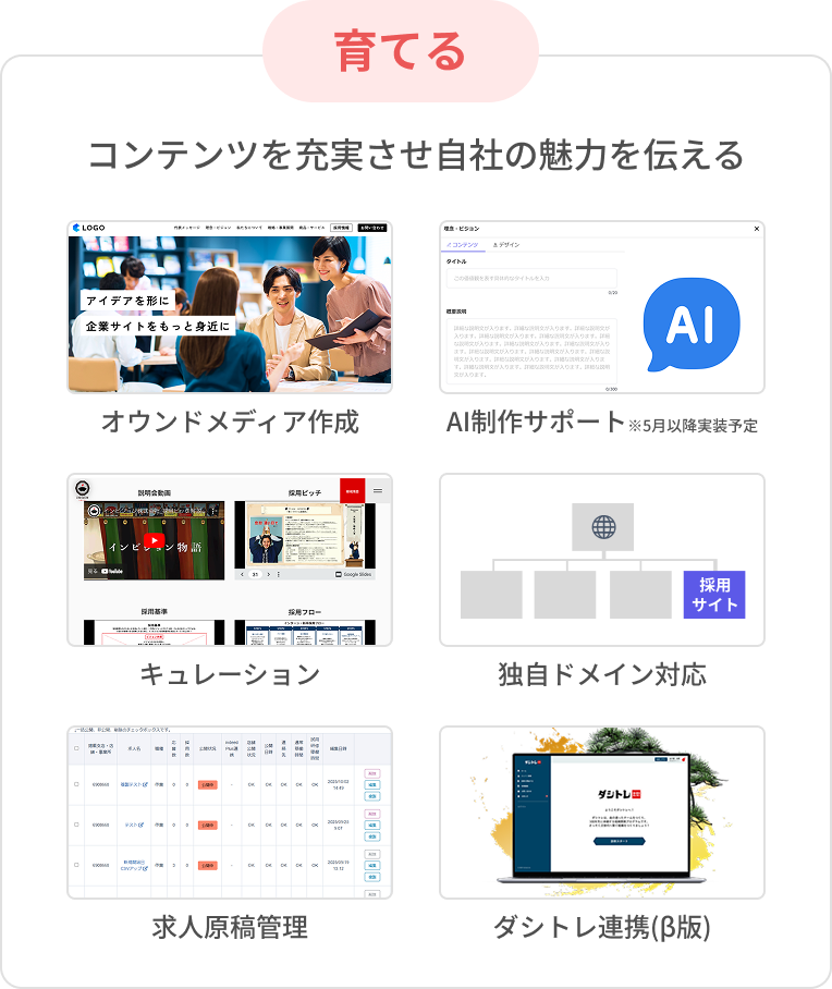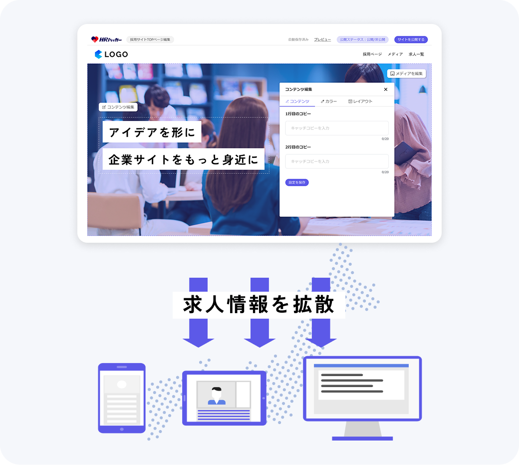 特別な知識がなくても採用サイトをノーコードで作成、求人情報を拡散できます。オンラインでの仕事探しに対応する第一歩を踏み出しましょう。