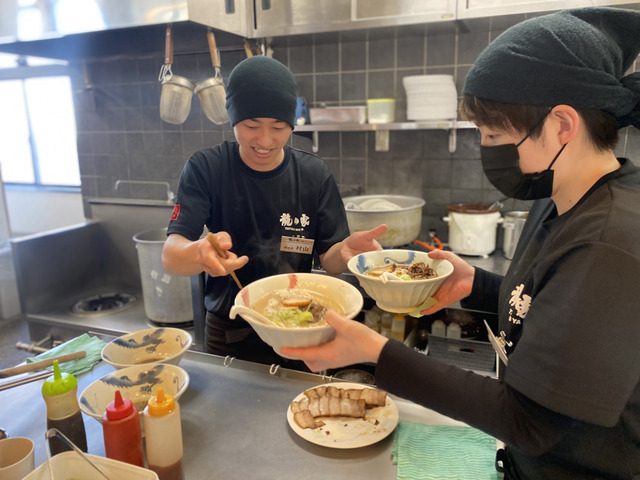 | 仕事内容 | 【大学生・専門学生・フリーター・主婦(夫)さん大歓迎!ラーメン店「龍の家」で一緒に働こう!】 \新メンバー大募集!一緒に始める仲間がたくさん♪/ *ラーメンが好きでも、そうじゃなくてもOK! * 初バイトも大歓迎!先輩がしっかりサポートします♪ * 週1日〜・1日3時間〜OK!学校やサークルと両立できます◎ * 平日の授業終わり・土日だけなど、シフトの融通バツグン * 嬉しい食事補助あり!スタッフ特別価格でラーメンを食べられます この求人を見てくださっている方には、 ラーメン龍の家のことを 「知ってる!食べたことある!」 「お店は知っているけどまだ食べたことないなぁ」 「いや、店名も初耳で...」 このような方もたくさんいらっしゃると思います。 ですが龍の家を知っている方も、そうではないという方も大歓迎です! 遠慮せずにご応募ください^^ ラーメン龍の家は、 本気でこだわる“とんこつラーメン”をご提供しており、 毎日じっくり炊き上げる濃厚とんこつスープが自慢です! 「本当においしいラーメンを届けたい」という想いで、味にもサービスにも妥協はしません! ー 楽しく働きながら、人としても成長できる ー それがラーメン龍の家です! 《ホールのお仕事内容》 ・お客様の案内、お冷やご提供 ・ラーメンの配膳 ・テーブル清掃 ・割りばしや辛もやし、紅ショウガ、高菜などのトッピングの補充 ・お会計 ・ビールや飲料の用意 ・仕込みの手伝いやお皿洗いなどキッチン業務のサポート ◆入社後は! まずは、元気に「いらっしゃいませ!」と言えれば大丈夫です! その後、一緒に働くスタッフとコミュニケーションを取りながら、お店の雰囲気に慣れていただいたら、今度は先輩と一緒に接客の仕方やラーメンの配膳の仕方などを学びましょう。 難しい業務はありませんので、ホールや接客が未経験の方でも1週間ほどで基本的な業務には慣れることができるかと思います。 また、先輩スタッフもすぐフォローができるよう体制を整えていますので、ご安心ください! |