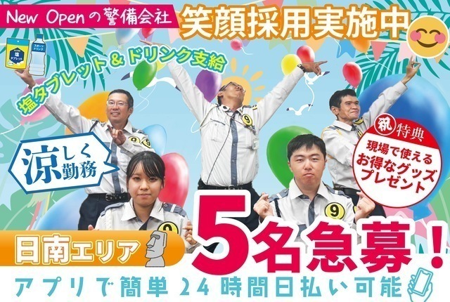 仕事内容 | 4/1〜NEW OPENに伴い、10名以上の積極採用実施中♪ ナインアクシアは鹿児島を本社に構え、南九州に展開している警備会社になります。大手会社との取引多数により仕事量の安定◎ 1人1人のワークライフバランスを重視した勤務も実現可能です♪ また最新システムを活用し、24時間体制での給与支払いを実現化しております。 \地域に密着して勤務可能/ 未経験からゾクゾク入隊してます! 大手電気通信工事の警備業務をお任せ! 具体的には、 車や歩行者を誘導することがメイン業務となりますので1度覚えてしまえば 短期間で活躍可能です!更に資格を取得すれば手当もUP! やりがい抜群◎キャリアUP制度あり 原則2人1組以上での勤務になりますので、困ったときも先輩のフォロー体制バッチリですので、 専任の教育スタッフが1人1人丁寧にサポート致します。 ◎勤務地は? 日南市内一円 他近隣エリアにより異なります。 自宅近くでの勤務ok 免許や移動手段がない方も乗り合わせで対応◎ ◎未経験でも大丈夫! 3日間×7時間の法定研修+実務研修があるので1から学べます! 警備の基礎的な座学研修からスタートし、車や歩行者の誘導のやり方など 1人1人丁寧にご説明させていただきます。 今働いている従業員の95%が未経験からスタートしていますので 新人さんの気持ちを理解してくれますし、超面倒見が良い先輩が多いんです。 ★学歴経験・一切不要☆ 当社は完全人柄採用を行っております。 また面接も面談に近い形式で行っておりますので ざっくばらんにお話ししましょう |