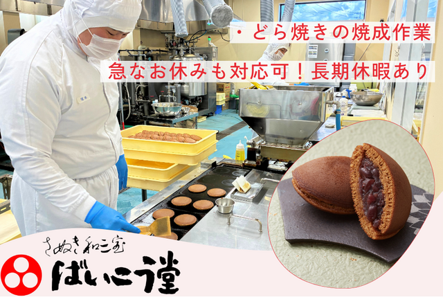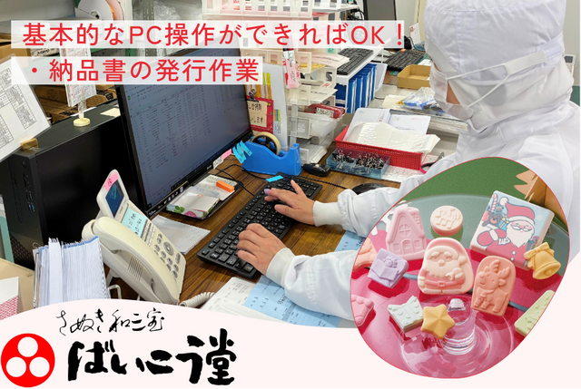 | 応募資格 | 【学歴不問、経験不問、無資格OK!】 未経験・ブランクがある方も歓迎します! <必要スキル> ・基本的なPC作業ができる方 Excel、Wordで文字・データ入力ができる メールの送受信ができる <以下の知識・経験がある方は大歓迎です!> ・お菓子の製造に関する知識 ・食品関係の工場勤務経験がある方 ・機械を扱うことに抵抗がない方 ・事務職の経験がある方 ■現在活躍しているスタッフたちの前職は? 水産業の営業、工場勤務、製造、一般事務etc... 高卒入社でずっと勤務しているスタッフも多数! <以下、ひとつでも当てはまる人大歓迎◎> ・円滑なコミュニケーションがとれる方 ・何事にも前向きにチャレンジできる方 ・視野が広く、マルチタスクに抵抗がない方 ・コツコツ、モクモク作業が好きな方 ・お菓子が好きな方(ばいこう堂の商品が好きな方大歓迎♪) |