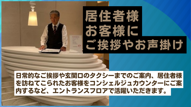 | 福利厚生 | ・交通費全額支給(規定あり) ・制服貸与 ・有給休暇 ・インストラクター、先輩コンシェルジュ・ポーターなどによる現場研修 未経験者歓迎!人と接することが好きな方ならOK! 充実の研修制度があるので安心 |
