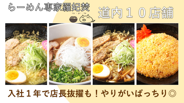 | 応募資格 | ・経験不問 ・らーめん店での業務経験がある方優遇 <こんな方と働けたら嬉しいです!> ・らーめんが好きな方 ・誰かの笑顔が喜びになる方 ・食べ歩きが好きな方 ・お話しするのが好きな方 ・新しい事にチャレンジするのが好きな方 |