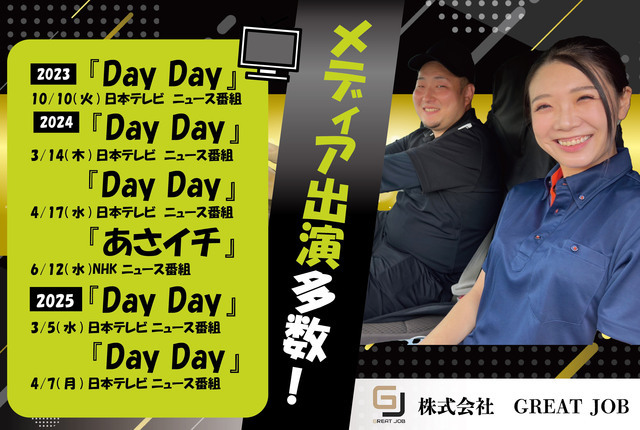 | GREAT JOB 軽貨物事業部はメディアにも数多く出演しています! | 2023年10月10日(火) 日本テレビ ニュース番組『Day Day』 2024年3月14日(木) 日本テレビ ニュース番組『Day Day』 2024年4月17日(水) 日本テレビ ニュース番組『Day Day』 2024年6月12日(水) NHK ニュース番組『あさイチ』 2025年3月5日(水) 日本テレビ ニュース番組『Day Day』 2025年4月7日(月) 日本テレビ ニュース番組『Day Day』 株式会社GREAT JOBは軽貨物業界のリーディングカンパニーとして 首都圏を中心に活動しております。 主にAMAZONの配送、その他業務委託のスポット配送、チャーター、フードデリバリーや企業向けの配送など様々な配送事業を行っております。 2023年10月10日(火)に日本テレビのニュース番組『DayDay』において弊社の軽貨物事業部が取り上げられました。 『置き配ポイント策』という特集の中で弊社ドライバーに密着し、現場のリアルをお届けすると同時に、配送業界の大きな問題である再配達を減らすためにどのような方法があるのかも放送されました。 今後、置き配を選んだお客様にポイントが付与されればドライバーの負担も減り、更に働きやすい業界になることが予想されています。 弊社は軽貨物業界のリーディングカンパニーとして、置き配における再配達問題の解決やドライバーさんの業務負担の軽減に向けて様々な対策を行なっています。今後も所属ドライバーが働きやすく長続きできる職場環境を作っていきます! |