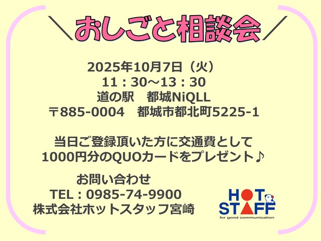\都城登録説明会を実施致します/ ◆日時: 2025年10月7日(火) ◆時間: 11:30~13:30 ◆場所: 道の駅 都城NiQLL 〒885-0004 都城市都北町5225-1 お仕事のお悩み・ご相談何でも結構です! 私達ホットスタッフ宮崎にお聞かせください! 貴方にあったお仕事をお探しします! 当日お越し頂いた方に交通費として 1000円分のQUOカードを進呈させて頂きます!! 皆様にお会いできるのを楽しみにしております♪ \お仕事開始までの流れ/ 1)電話応募/WEBからの応募 (WEBからの応募はエントリー完了後にホットスタッフ宮崎よりご連絡致します) ↓ 2)面談・登録 事務所面談・WEB面談・出張面談より選べます! 面談の際はお子様もご一緒に来て頂けます♪大歓迎ですのでご安心してください! また、都城の求人は出張面談も行っておりますので、ご相談ください。 希望条件はもちろんご不安なことも何でもお話し下さい! より条件に合うお仕事をお探しします!! ↓ 3)見学 担当と一緒に見学に行きましょう! お仕事内容、職場の雰囲気、ご自身で確認できますよ! \さあ♪まずは登録!/ 「話を聞くだけ」「まだ就業中だけど今後の為に登録だけ」そんな方も大歓迎! ・フリーダイヤル 0120-74-9903 (土日の電話応募も対応しております) ・簡単WEB登録 登録後、担当よりお電話またはメールにてご連絡します [2分で登録OK!かんたんWEB登録](https://www.hotstaff.co.jp/hotkensaku/web_registration) \ホットスタッフ宮崎の求人一覧/ [ホットスタッフ宮崎の求人一覧はコチラ](https://www.hotstaff.co.jp/hotkensaku/jobsearch/45/search?type=city&branch_id=1021) 随時更新中!! ホットスタッフ宮崎があなたを全力で応援します!! |