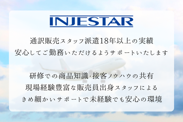 | アピールポイント | ・即日スタート可能 ・英語力を活かせます ・事前研修充実 ・大手企業の店舗で、安定した長期的な勤務も見込めます |