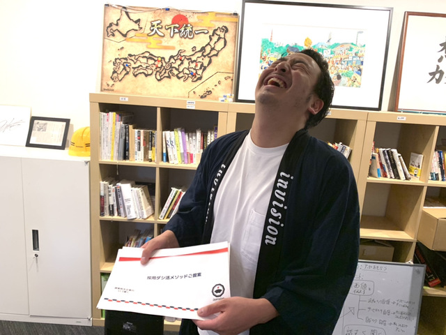 (0)カジュアル面談 まずはオンラインでざっくばらんにお話ししましょう! ↓ (1)本選考に進むと希望された方は書類選考となります 顔写真付履歴書とオリジナルのエントリーシート(後日説明あり)をご送付ください。 ↓ (2)適正検査+オンライン面談 テストを受講していただき、取締役との面談を実施 ↓ (3)最終面談:来社 人生レポートを作成いただき、代表吉田と面談を実施 https://www.invision-inc.jp/our-dashi/_seigo-yoshida/ ↓ (4)内定 ※内定まで最短で2週間ほどを予定しております |