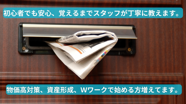 | 最後に | 新聞というメディアは時代とともに変化していますが、「人が人に届ける」価値は今も変わりません。新聞販売店は、地域の情報と人を結ぶ大切な役割を担っています。 「誰かのために働きたい」「地域に根差した仕事がしたい」 そんな思いを持っている方と、ぜひ一緒に働けたらうれしいです。 やる気があれば誰でもできるお仕事です。 ご応募、お待ちしています。 |