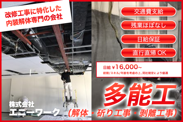 株式会社エニーワーク 新宿区 多能工(解体・斫り工事・剥離工事)