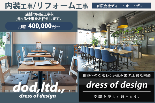 有限会社ディー・オー・ディーについて | 弊社では、設計から全ての工程の内装工事を担当。 内装工事やリフォームにおける一貫した技術や知識を身につけることができるので 独立を目指したい方や経験を積みたい方にぴったりです。 |