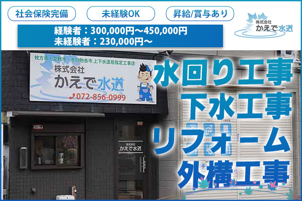 仕事内容 | 【未経験歓迎】水道・リフォーム工事スタッフ募集! \生活に身近な“水”のコンシェルジュカンパニーで働きませんか?/ 当社は枚方市を中心に、水道工事・リフォーム・下水工事・外構工事など、生活に欠かせない「水回り」や住環境整備を手掛ける専門企業です。 地域密着で水道工事に携わり、20年以上の実績を持ち、おかげさまで安定した仕事量があります。 今回は、経験者はもちろん未経験の方も大歓迎! 転職をお考えの方や、一人親方として活動されている方のご応募も大歓迎です。 将来的に「独立して自分の会社を持ちたい」という意欲のある方には、ピッタリの環境。 技術を身につけ、成長していける現場がたくさんあります。 まずはお気軽にお問い合わせください! |