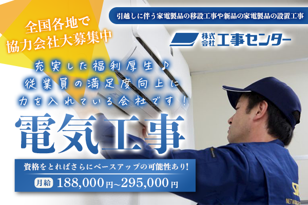 経験がなくてもOK!工事経験が積める! | 家電設置スタッフとしてスキルアップするためには現場にたくさん足を運び たくさんの経験を積む必要がありますが、大手引越し会社様や TV通販会社様から年間多くの工事依頼をいただいているので 着実に工事経験を積みスキルアップしていくことが可能です。 また先輩社員がしっかりサポートしてくれるので、安心してスタートをきれますよ。 |