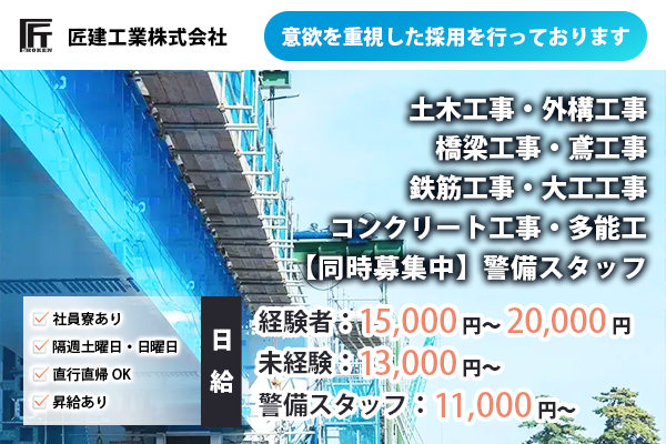 匠建工業株式会社 ・土木工事 ・外構工事 ・橋梁工事 ・鳶工事 ・鉄筋工事 ・大工工事 ・コンクリート工事 ・多能工 ※【同時募集中】警備スタッフ