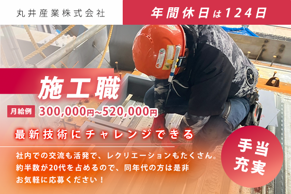 | 仕事内容 | 施工職は、建物づくりの基盤を支える重要な役割です。 当社では、コンクリート工事・スリーブ工事・インサート工事・止水工事・キソエース工事・コア抜き工事・ワイヤーメッシュ工事・隙間フェンス(層間ふさぎ)工事・制作架台設置工事・防火区画工事(電気設備)など、幅広い施工を手掛けています。 施工管理の経験を活かせるのはもちろん、現場経験を積んだ方が次のステージに挑戦できる場としても大きな魅力があります。 多様な工事を通じて技術力を磨き、資格取得支援や技術手当によって努力が正当に評価される環境です。 自分の手掛けた仕事が形として残り、人々の生活に直結するという達成感は格別。 安定した経営基盤を持つ当社で、長く安心して働きながら、技術者として成長していきませんか? YouTubeチャンネルにて、施工内容を紹介中! https://www.marui-sangyo.jp |