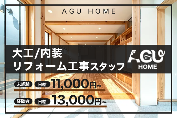 AGU HOMEはこんな会社です! | 立ち上げ6年目、20代、30代がメインのスタッフでこれからますます成長する会社です!確実丁寧な仕事で信頼を得ている会社ですので、安定した業績で走り続けて来られました。 明るくて穏やかなメンバーなので集中して仕事に取り組めまる環境。 質問や意見交換などもしやすいフラットな関係なので、楽しく作業が出来ます! 現場で一緒に働く人達も気さくな方が多いので、馴染みやすいと思います。 |