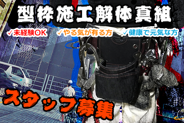 仕事内容 | 住吉区にある「型枠施工解体真組」では新規スタッフ大募集中!未経験者の方でもやる気があれば大丈夫!フレッシュな元気のある方を募集しております! |