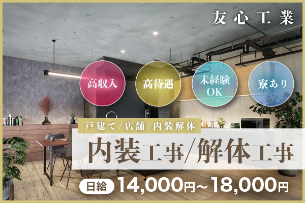 業績絶好調の友心工業 | 日給 14,000円~18,000円+手当と、かなり高めのお給料体制!! 頑張りによっては、未経験者の方でも高収入を狙うことが十分に可能ですよ!! 経験者の方も培ってきた経験や資格によって、更に手当を支給されることも!! 未経験でも好待遇、働きやすい会社です 日払い、週払いOKでスタート日給14,000円! 寮・社宅も完備で生活面のサポートも充実! 先輩スタッフは異業種からの転職や社会人デビューの方も多く、未経験でも安心して初めていただけます。 努力重視で随時昇給もあり、頑張ればその分自分に返ってくるので稼ぎたい方は是非お気軽にご連絡ください! |