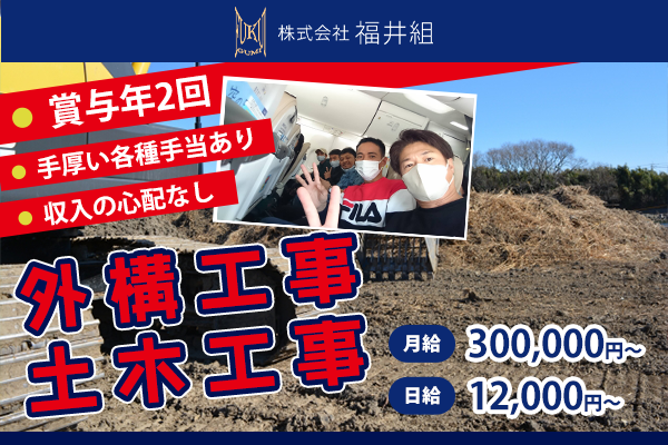 仕事内容 | 各現場にて外構・土木工事業務全般のお仕事をお願いいたします。 大手ゼネコンの仕事を受けているので、仕事も安定してあります。 4、5人のグループに分かれ、各現場へ向かい作業をしますので、分からないことはすぐに尋ねることができる環境です。 最初は何もわからなくて当たり前。人それぞれ成長スピードが違って当たり前。得意・不得意があって当たり前。 わかるまで、丁寧に指導し、1人前の職人になれるよう全力でサポートいたします! もっと技術を身に着けたい。資格を取って活躍したい。 さらに上を目指す意欲にもしっかり応えます。 |