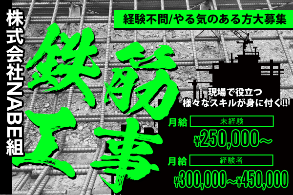 仕事内容 | 建物や橋梁の骨組みとなる鉄筋の加工・組立など、工事現場での作業をお任せします。 鉄筋工事は建物の強度を支える重要な仕事で、やりがいは十分。 未経験の方は簡単なサポート業務からスタートし、徐々にステップアップ! 経験者はスキルを活かし、即戦力として現場で活躍していただきます。 |