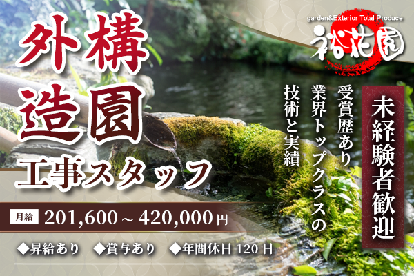 仕事内容 | 住宅の外構・エクステリア工事、庭造り・手入れ等の造園工事、建物外周りの工事のほか、土木工事や公共事業の除草・樹木の手入れ等を行うこともあります。 オシャレな和風庭園、ガーデニング・造園、玄関アプローチ、外構、カーポートなどを扱う仕事なので、やりがいや面白さを思い切り感じていただけます。 |