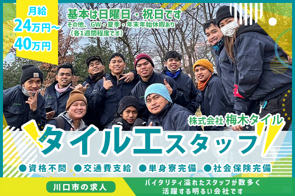 仕事内容 | 株式会社梅木タイルは、関東エリアを中心にビルやマンションの改修工事、タイル張り工事を手掛けています♪ 社長は南さつま市金峰町の出身で、その暖かく親しみやすい人柄が社内にも反映されています◎ 一般社団法人全国タイル業協会の会員として、業界の最前線で活躍しています! |