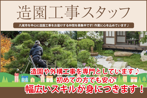 仕事内容 | 私たち二鷹造園土木は、大阪府八尾市を拠点に個人宅やマンションの 造園や外構工事を専門としています♪ 地域密着型で地元のお客様に誠心誠意をもって接し、 美しく機能的なお庭づくりを目指しています♪ 初めての方でも安心して相談できるよう、 すべての工程を自社の熟練職人が一貫して担当◎ 質の高い施工を適正価格で実現しています! |