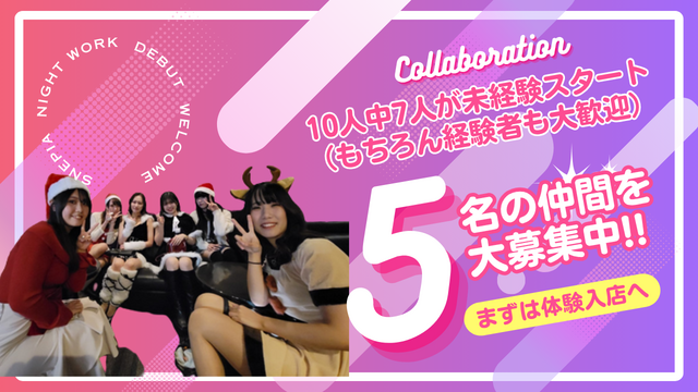 | こんな人にピッタリ! | ・スポット・短期/Wワークや長期も大歓迎!! ・ナイトワークデビューの方も多数います! ・ノンアルOK、ノルマも一切ないので安心 ・学生さん、フリーターさんも大歓迎! |