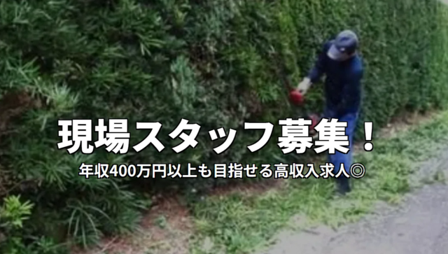 仕事内容 | 私たちの仕事は、個人宅のお庭や公園、街路樹など、身近にある緑の美しさを守り、育てることです! 初めは、草や枝を拾うなど、簡単な作業からスタートしていただきますのでご安心ください◎ 慣れてきたら、樹木の剪定や街路樹の整備など、少しずつ専門的な業務にも挑戦していきましょう! 30年以上の実績を持つ当社は、一年を通して仕事量が安定しています! 造園や林業に興味がある方、体を動かすことが好きな方にはぴったりの仕事です♪ 一生モノの技術を身につけながら、地域に緑と安らぎを届けるやりがいを一緒に感じていきませんか? |
