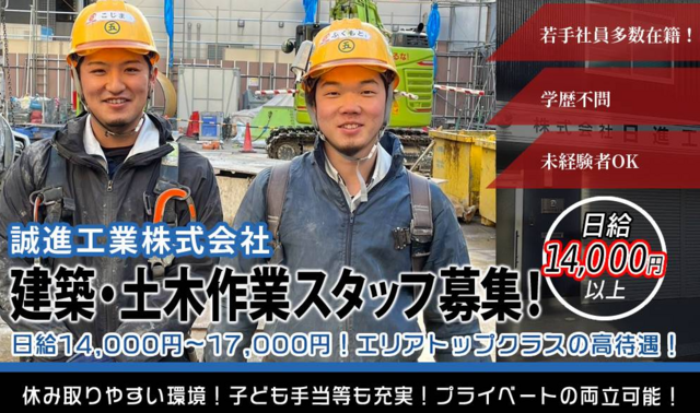 【門真市・京阪大和田駅】未経験歓迎の正社員◎誠進工業で建築土木作業スタッフ募集♪交通費支給&資格取得支援あり!日給14,500円〜17,000円の魅力的な条件♪休みもしっかり取れる環境♪