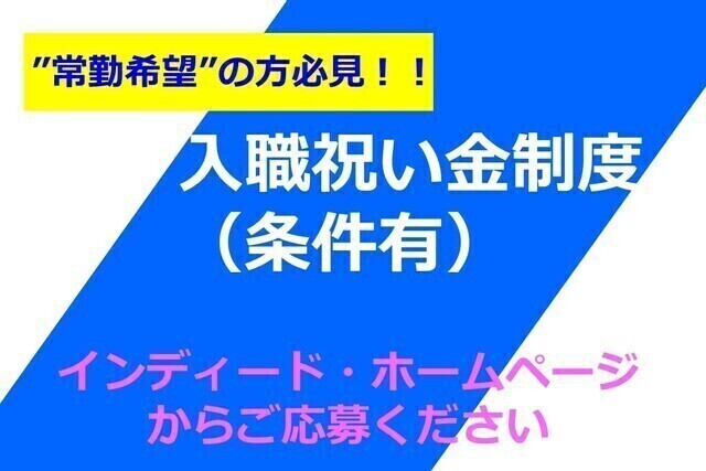 | 応募、面接にあたって | 転職を具体的に考えていない方も見学だけでもいらしてください! 面接時は履歴書(PC入力可)、必要に応じ職務経歴書をお持ちください。面接時は私服で構いません! 幅広い年代の方を募集しています!経験やスキルよりも人柄重視の採用です。世間話などしながらリラックスした形で面接を実施しております。面接は基本1回で、面接日はご都合に合わせて随時設定いたします。簡単な適性検査のみございます。 お会いできる日を心待ちにしております。 |