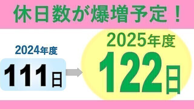 | 休日休暇 | ◇年間公休数122日(2025年度) ◇有給休暇 ◇産前産後休業 ◇育児介護休業 ◇特別休暇 ・慶弔休暇 ・子の看護休暇:年5日(対象者2人以上の場合は年10日) ・介護休暇:年5日(対象者2人以上の場合は年10日) ※年間休日と有給休暇とは別で取れる、給与支払い有の特別休暇です! ※勤務条件による |