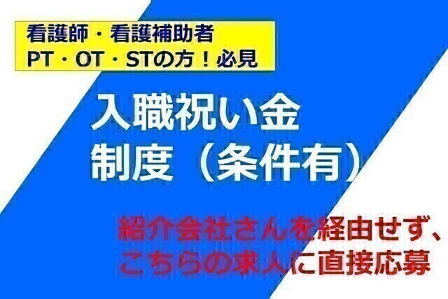 | 「入職祝い金制度」をご用意☆こちらの求人からの応募者限定☆※新卒者は対象外 | 【支給対象職種】 〇 言語聴覚士 〈資格取得者、既卒者〉※新卒者は対象外 【支給要件】 ・紹介業者様などを介さず、直接応募された方に限ります。 ・入職日から6か月以上勤務で、該当給与支給日に合算して支給します。 ・職種や勤務形態(常勤・嘱託・パート)により支給額が変わりますので、必ず面接時にご確認ください。 【支給額】 ・言語聴覚士 常勤職員・・・200,000円 |