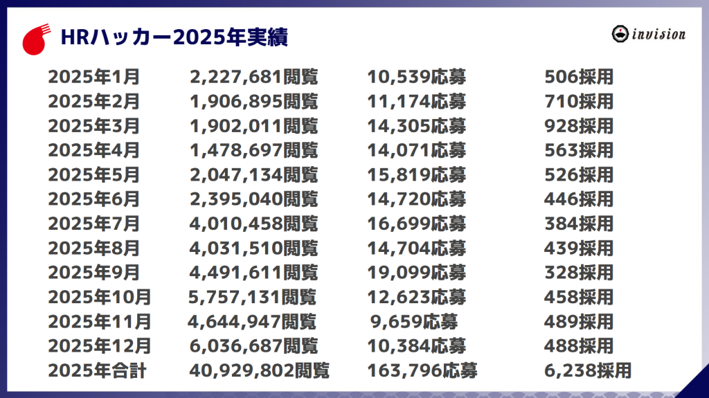 2025年12月度にHRハッカーの閲覧数・応募数・採用数は以下のとおりです。