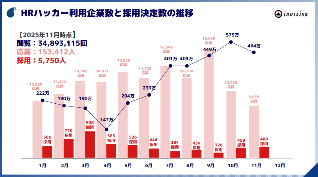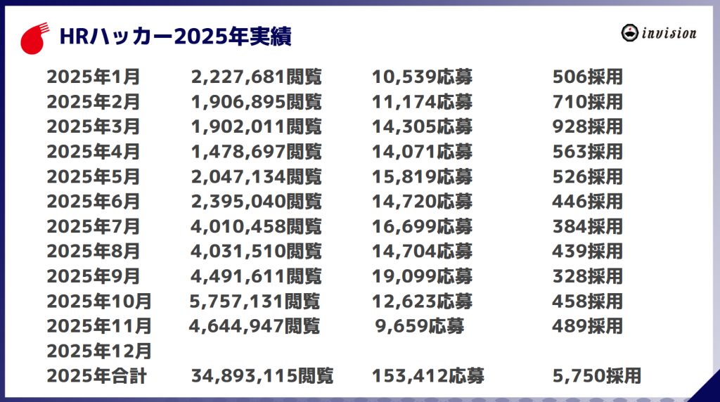 2025年11月度にHRハッカーの閲覧数・応募数・採用数は以下のとおりです。